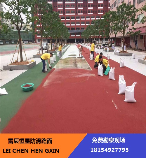 冷涂型彩色防滑路面材料的類型有丙烯酸型、環氧型,聚氨酯型等,其為液態。施工時,無需大型設備,只需將基料與固化劑按比例混合后,用滾涂的方式涂鋪于路面,并添加防滑沙層,經過化學交聯反應,快速固化成堅韌的漆膜,形成彩色防滑路面。 施工簡單,快速簡便,目前已經成為市場主要的選擇對象。其中聚氨酯型由于其綜合性能更有優勢,所以在國內目前的市場占有率*高。