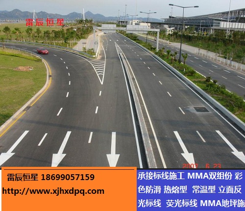 道路交通標線主要劃設于道路表面,經受日曬雨淋,風雪冰凍,遭受車輛的沖擊磨耗,因此對其性能有嚴格的要求。首先要求干燥時間短,操作簡單,以減少交通干擾;其次要求反射能力強,色彩鮮明,反光度強,使白天、夜晚都有良好的能見度;第三,應具有抗滑性和耐磨性,以保證行車安全和使用壽命。