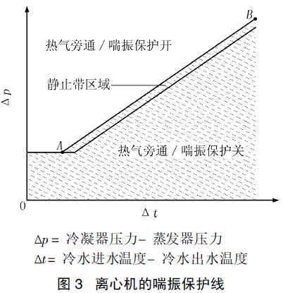 機(jī)組通過本機(jī)集總控制裝置(PIC)監(jiān)測壓縮機(jī)電機(jī)的電流來判斷機(jī)組是否進(jìn)入喘振工況。一旦機(jī)組電流的波動(dòng)幅度超過一定值(默認(rèn)是25%,也可以通過控制面板LID設(shè)定)達(dá)1s,控制系統(tǒng)就會(huì)記下一次喘振。如果在設(shè)定時(shí)間段內(nèi)( 默認(rèn)是5 min) 這樣的波動(dòng)達(dá)到12次,控制系統(tǒng)就認(rèn)為機(jī)組運(yùn)行進(jìn)入了喘振工況, 機(jī)組就會(huì)停止運(yùn)行并報(bào)警(EXCESSIV E COMPR SU RGE)。這樣就對機(jī)組進(jìn)行了保護(hù),防止喘振對機(jī)組的損壞。此外,還可以通過可選配件-熱氣旁通閥,當(dāng)機(jī)組將要進(jìn)入喘振工況時(shí)打開熱氣旁通閥來改善機(jī)組的工況,達(dá)到對機(jī)組的喘振保護(hù)。