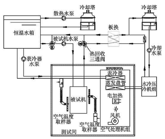 風(fēng)冷冷(熱)水機組測試時,通過空氣處理機組將風(fēng)冷冷(熱)水機組風(fēng)側(cè)產(chǎn)生的冷熱量進行處理,使得測試間內(nèi)的溫濕度達到國標(biāo)要求的值。而機組產(chǎn)生的冷熱水回到水箱后,通過水箱配置的冷熱源進行平衡,從而達到機組在國標(biāo)要求的工況下穩(wěn)定運行,采集系統(tǒng)將所有的測點采集,通過電腦內(nèi)專業(yè)計算軟件進行計算輸出實驗報告。