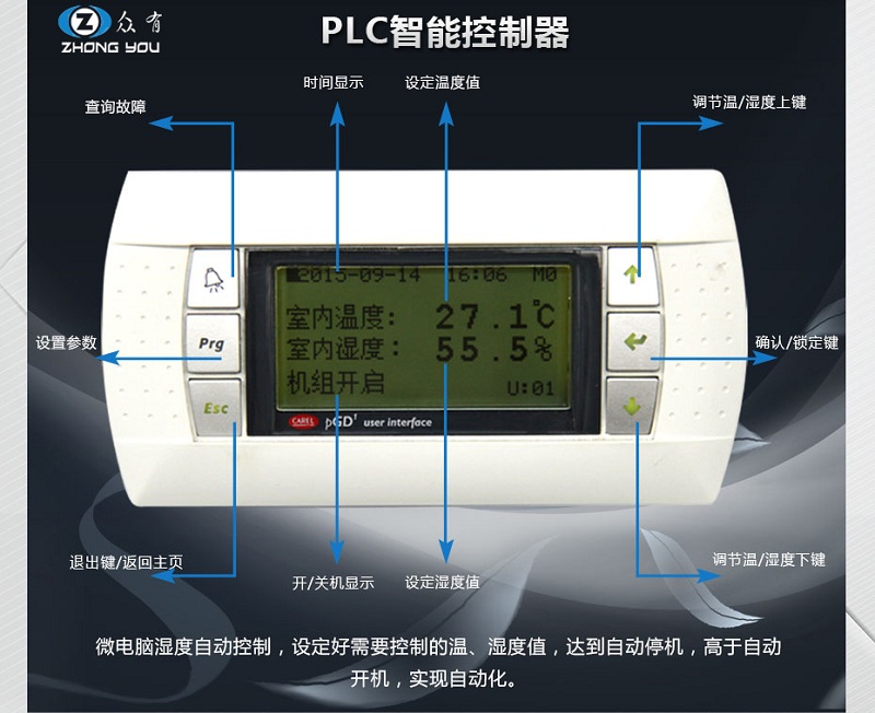 1. 采用國際品牌可編程PLC控制器,獨有的微電腦智能全自動控制系統(tǒng),用戶只要設(shè)定好所需的溫濕度控制范圍,機組即自動判斷運行負荷進行能量調(diào)節(jié),按最經(jīng)濟的運行模式自動運行,節(jié)約了運行費用;控制器預(yù)留遠程控制接口,可方便用戶遠程集中控制,節(jié)省管理。